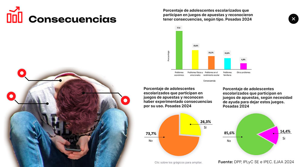 Los adolescentes dieron cuenta además del impacto que sufren como consecuencia de los juegos de apuestas. “Más de un tercio de los encuestados (26,3%) dijo que los juegos de apuestas le generaron algún tipo de consecuencias: el 37,6% problemas económicos, 19,6% problemas físicos y emocionales, 19,2% problemas en el rendimiento escolar, 16,8% problemas familiares”, detallaron.