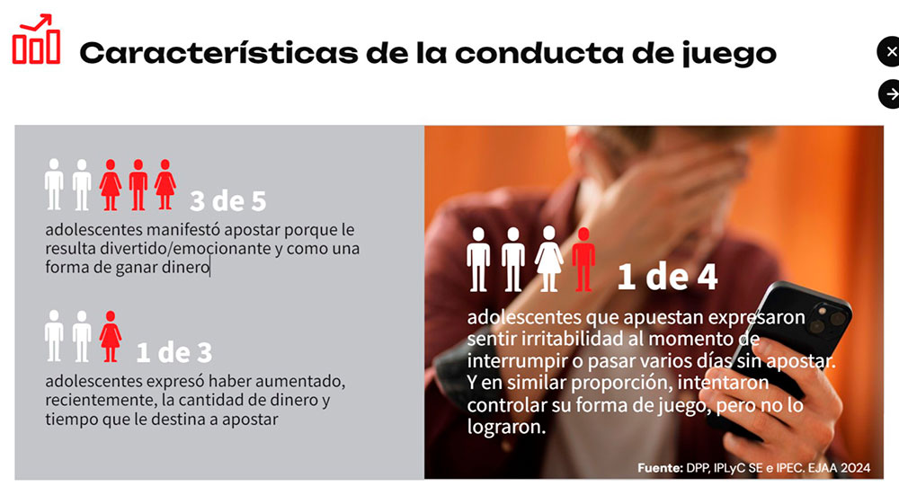 Además, 1 de cada 3 encuestados admitió haber aumentado recientemente la cantidad de dinero y tiempo que destina a apostar. El estudio midió también el nivel de dependencia emocional al juego: 1 de cada 4 adolescentes (24%) expresaron sentir irritabilidad al momento de dejar el juego o luego de pasar varios días sin jugar, mientras que el 76% restante dijo no sentir irritabilidad.