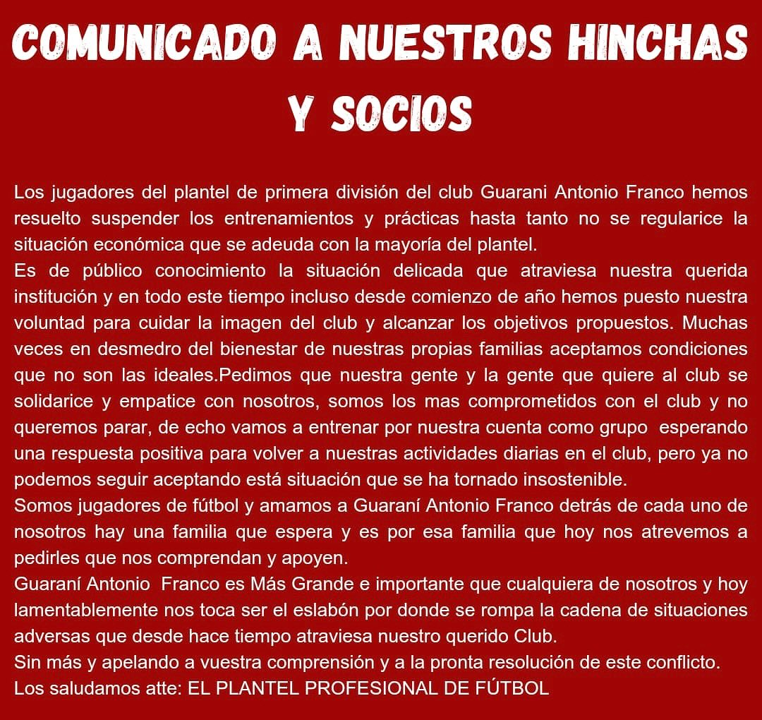 Los jugadores del plantel de primera división de Guaraní Antonio Franco decidieron este miércoles suspender los entrenamientos como medida de protesta ante el incumplimiento en el pago de sus salarios. En un comunicado dirigido a los hinchas y socios, los futbolistas explicaron los motivos detrás de la decisión y apuntaron contra la dirigencia.