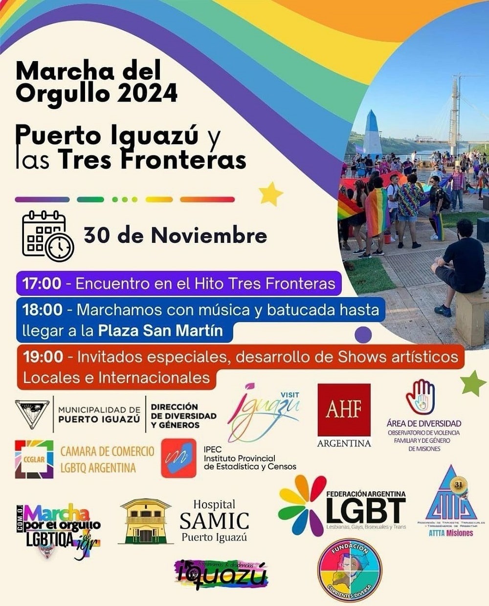 Este sábado a partir de las 17 horas, se realizará una nueva Marcha del Orgullo que partirá desde el Hito Tres Fronteras de Puerto Iguazú. Entrada: libre.