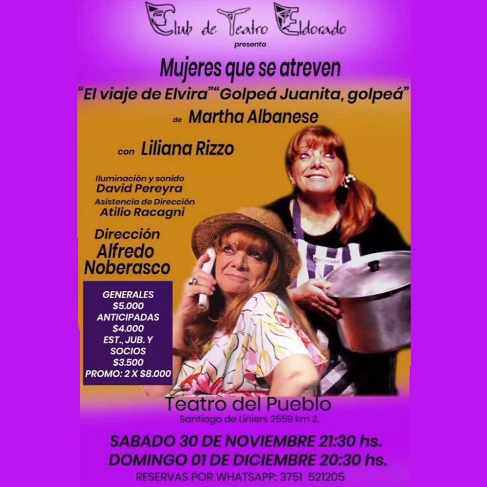La obra es una comedia que reúne dos monólogos de Martha Albanese, se presentará nuevamente el sábado a las 21.30 y el domingo a las 20.30 horas, en el Teatro del Pueblo (Santiago de Liniers 2559, Km2), de Eldorado. Entrada: $5.000. Promo 2 x $8.000. Estudiantes, jubilados y socios $3.000. Reservas al WathsApp 3751 521205.