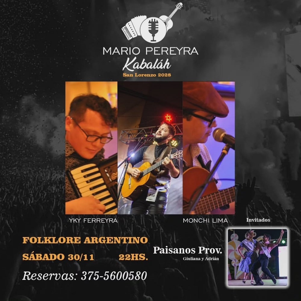 Mario Pereira, junto a Yky Ferreira (acordeón) y Monchi Lima (guitarra), brindarán este sábado a las 22 horas, un show a puro folclore argentino en el escenario de Kabaláh Resto Bar (San Lorenzo 2028), de Posadas. Entrada: Reservas al 375 5600580.
