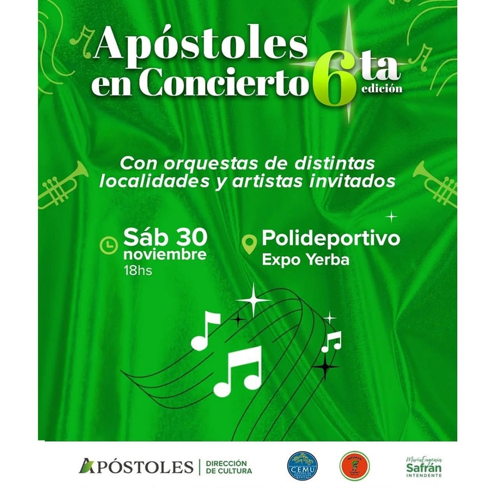 Más de 400 músicos de Corrientes y Misiones se reunirán, este sábado a partir de las 18 horas, en el Polideportivo de la Expo Yerba de Apóstoles. Entrada: un alimento no perecedero.