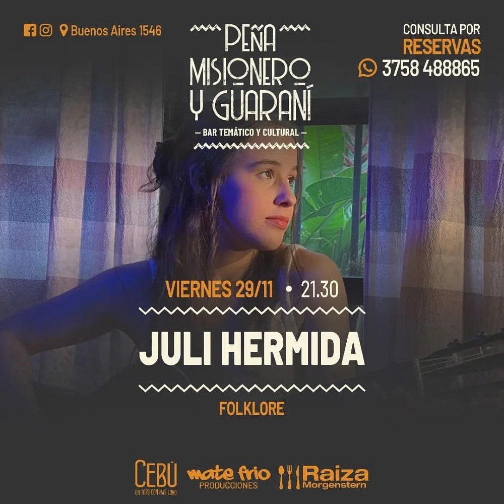 Este viernes, a las 21.30 horas, peña Misionero y Guaraní (Buenos Aires 1546), de Posadas recibe a juli Hermida. Entrada: $3.000. Reservas y consultas al 3758 488865.