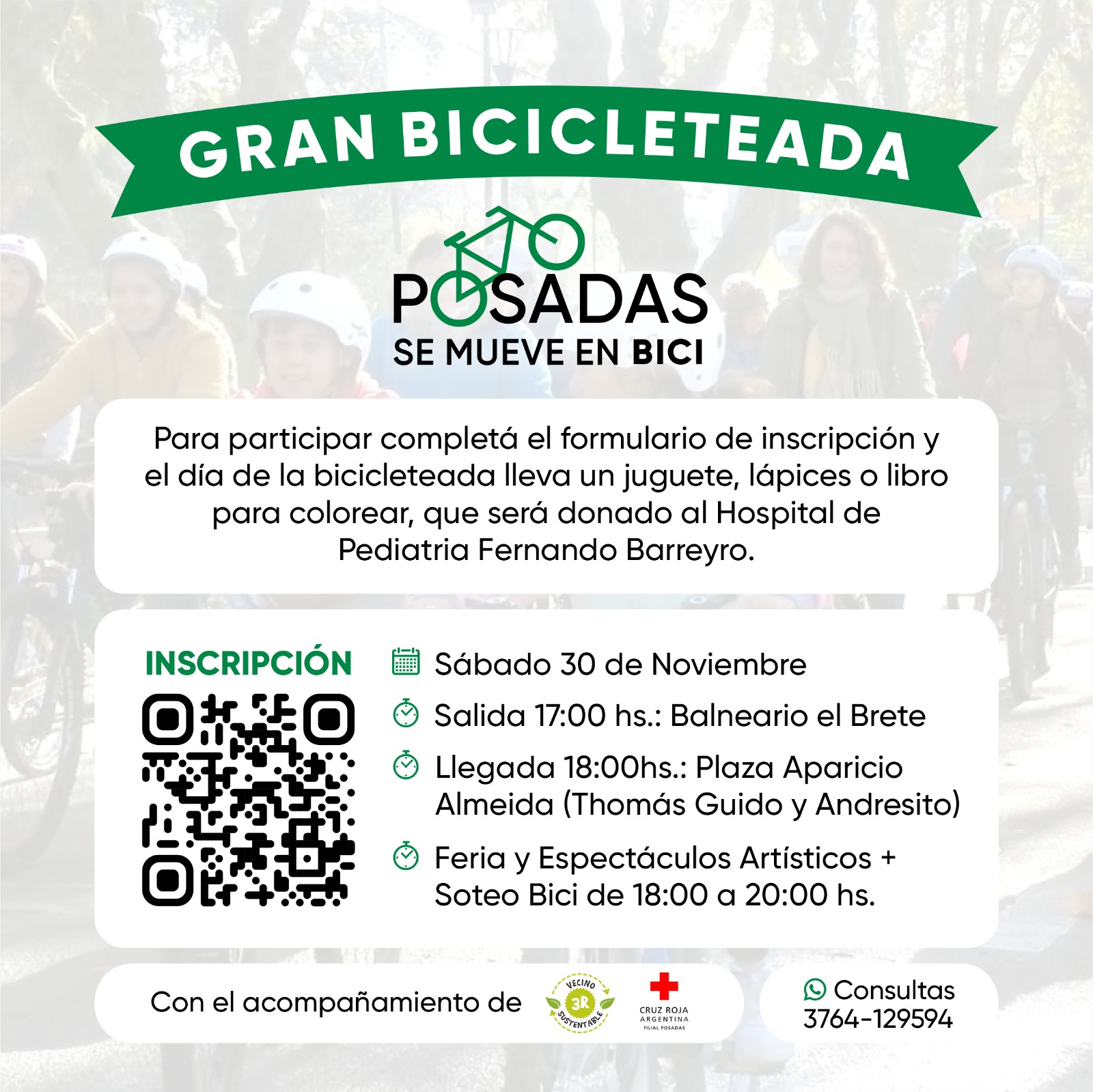Este sábado 30 de noviembre, a partir de las 17 horas, se llevará a cabo una bicicleteada solidaria para presentar el proyecto “Posadas se Mueve en Bici”, una iniciativa que busca fomentar la movilidad sustentable, la educación vial y el turismo responsable en la ciudad. El evento comenzará en El Brete y culminará en la Plaza Aparicio Almeida, con múltiples actividades para toda la comunidad.