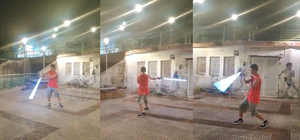 Mientras que relámpagos develaban siluetas de nubes oscuras sobre el horizonte, un sable luminoso cortaba el aire de la solitaria noche en un rincón ubicado al margen del arroyo Vicario. Se trata de Edo Kai, como más se lo conoce, un joven que reside hace 20 años en Misiones y quien como muchas otras personas, es fanático de las icónicas sagas de los años 80: Star Wars y de los Cazafantasmas.