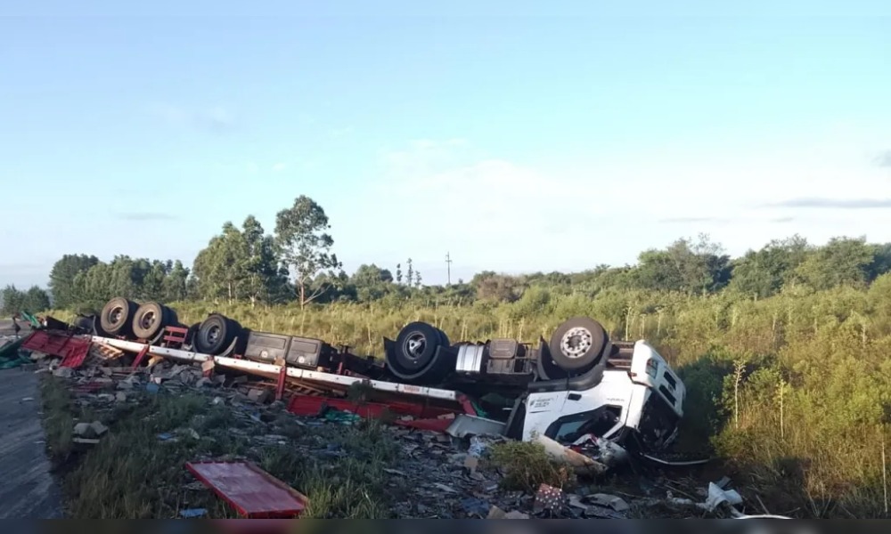 Según informó el portal Ahora, el vehículo involucrado fue un camión Iveco con acoplado que transportaba cerámicos. Por motivos que aún se investigan, el conductor perdió el control en una curva, provocando el vuelco.