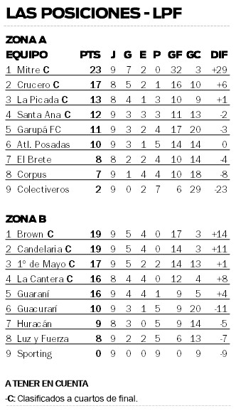 Aunque todavía quedan algunos partidos para completar el fixture, ya que están todos los clasificados. Por la Zona A están Mitre, Crucero, La Picada y Santa Ana; en tanto que en la Zona B avanzaron Brown, Candelaria, 1º de Mayo y La Cantera.