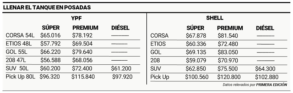 Del relevamiento de PRIMERA EDICIÓN, se destacó que llenar el tanque ahora, con carga en Posadas, requiere de $56.588 para un tanque de 47 litros que cargue súper o $68.056 si se trata de premium con precios de YPF y Shell por la misma cantidad. Ese monto se puede duplicar para una camioneta pick up con tanque de 80 litros que necesitará de $102.880 para súper; 120.800 para premium o $100.560 si utiliza diésel.