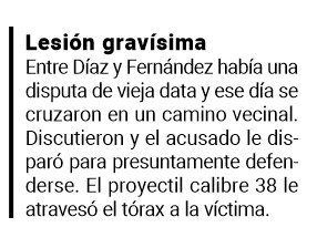 Tenían una enemistad previa y Díaz había querido agredirlo para sanjar una vieja disputa, pero no contaba con que Fernández andaba “calzado” con un revólver Colt Police Positive Special calibre 38. Le disparó y se fue del lugar para dirigirse a su casa a buscar algunas cosas y darse a la fuga, según la hipótesis de los investigadores.