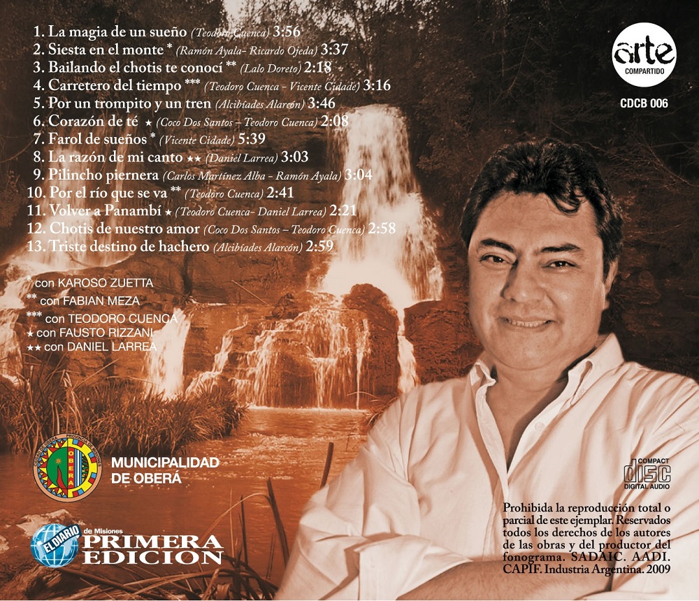 Llegó a Asunción, donde vivía, y en breve siguió viaje a Posadas para comentar la idea a algunos músicos. “Llegué a la conclusión que tenía que hacer un disco a lo Teodoro Cuenca, que tenía un sonido muy particular y muy localista. Me hubiera sido sencillo grabar en Asunción o en Buenos Aires, pero quería grabar un disco que sonara a Teodoro Cuenca, porque era ese el homenaje. Entonces, con Daniel Larrea hicimos una especie de selección de canciones e invité a algunos artistas que se sumaron agradecidos. Y fue así que empezamos a grabar. Cuando tuvimos el material terminado, había que editarlo, y el Diario PRIMERA EDICIÓN fue una de las empresas que hizo un aporte para que pudiéramos hacer un disco digno, en formato físico, con una cartilla con toda la información, con las letras y fotografías de lo que fue la producción. Y salió en 2009. Lo presentamos en varios lugares, entre ellos, la Fiesta Nacional del Inmigrante”, relató.