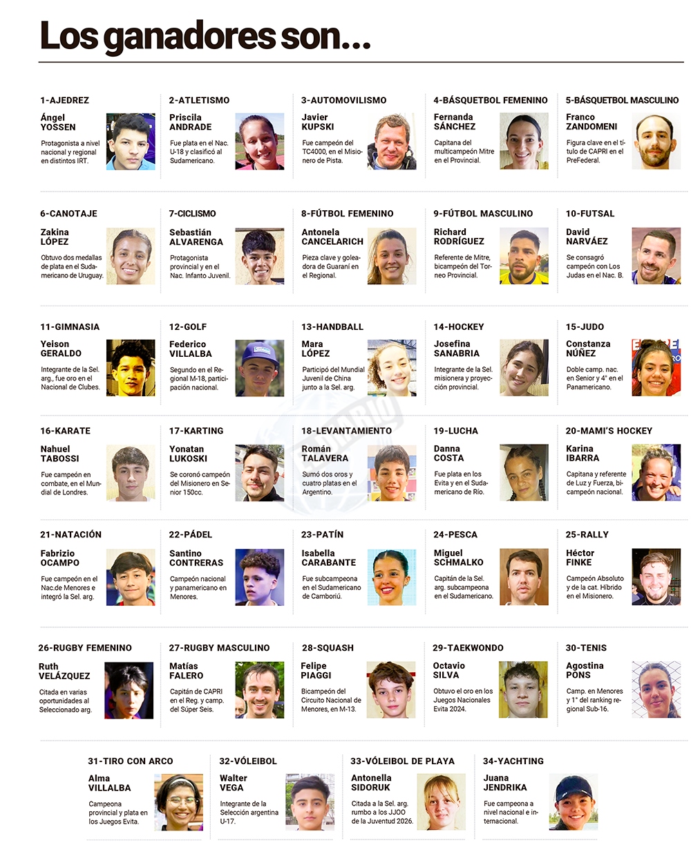 👉 Paulina Ojeda (básquetbol), Selectivo Misionero del Bayern Munich (fútbol), Ignacio Senger (BMX Freestyle), Ruth Feldick (skateboard), Mauricio Lovera (lucha), Emanuel Vázquez (canotaje), Milena Hiller (endurance), Santino Núñez Cuenca (mountain bike).