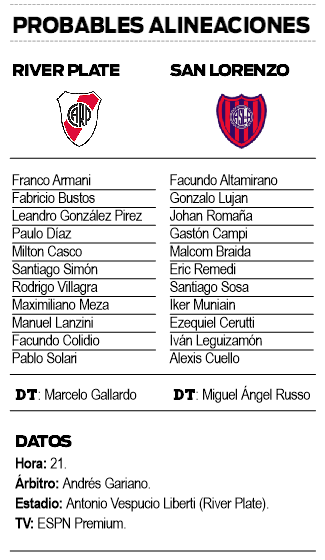 Otra historia distinta es la de San Lorenzo, que milita en los puestos del fondo de la Liga Profesional (22º). El equipo de Miguel Ángel Russo entró en una meseta, perdió con Racing y Belgrano en forma consecutiva y llega al Monumental con la necesidad imperiosa de volver a ganar para no cerrar el año de capa caída.