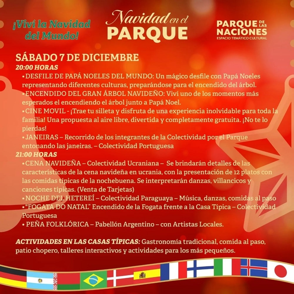 La Colectividad Portuguesa realizará sus tradicionales Janeiras – Recorrido de los integrantes de la Colectividad por el Parque entonando las janeiras. Además, la “Fogata Do Natal” Encendido de la Fogata frente a la Casa Típica.