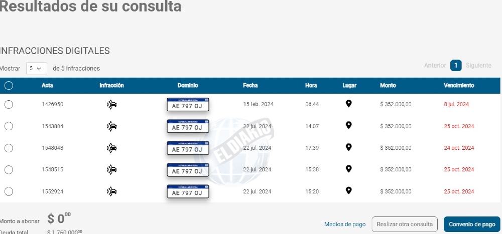 Según el sitio web, el vehículo matrícula AE797OJ cometió su primera infracción el 15 de febrero, a las 6:44, según quedó registrado en el kilómetro 1531, sobre la Ruta Nacional 12, en Puerto Piray.