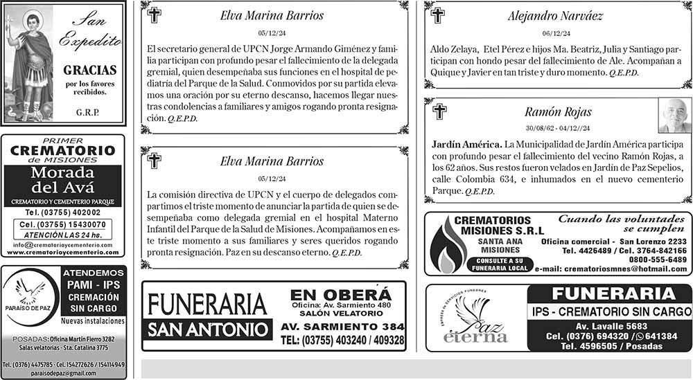 Fúnebres del Sábado 7 de Diciembre de 2024