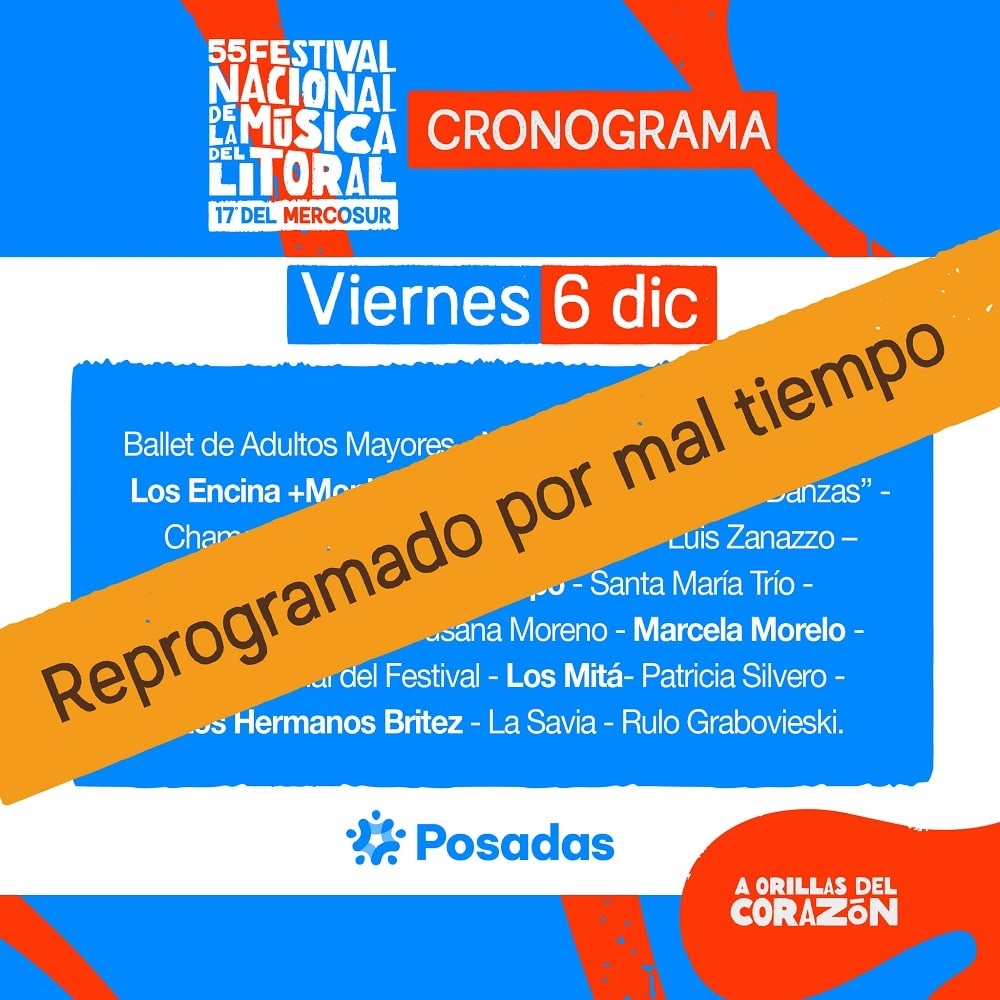 La realización de segunda noche del Festival de la Música del Litoral previsto para este viernes, se reprogramó hasta nuevo aviso. Quienes hayan adquirido sus entradas deberán conservarlas.