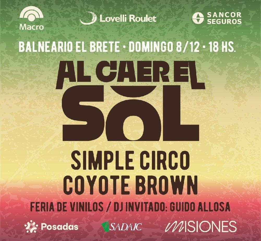 Con la incertidumbre sobre si las lluvias continuarán mañana, la nueva edición de Al Caer el Sol propone un atardecer con música en vivo y varieté circense a cargo de Simple Circo. Mientras que la banda de Coyote Brown pondrá todo el rock sobre el escenario. Además, estará la feria de vinilos del DJ Guido Allosa.