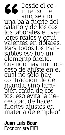 “Desde el comienzo del año, se dio una baja fuerte del salario y de los costos laborales en valores reales y equivalentes en dólares. Para todos los transables ese fue un elemento fuerte. Cuando hay un proceso de ajuste en el cual no solo hay contracción de demanda, sino también caída de costos, eso evita la necesidad de hacer fuertes ajustes en materia de empleo”, comentó Bour en una entrevista con Infobae.