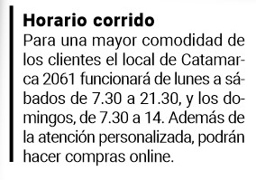 Describió que en el local de calle Catamarca podrán encontrar “todo lo existente en la sucursal de calle Córdoba, con la atención de personal joven, que hará primar la amabilidad y el buen servicio. No faltará la exquisita comida en la rotisería, panadería con elaboración propia, carnicería, verdulería, expendio de bebidas, y todo lo que necesite. Y en caso que no encuentre lo que busca, trataremos de brindar una solución. La permanencia y la elección son definidas por la seriedad que tenemos hacia el cliente”.