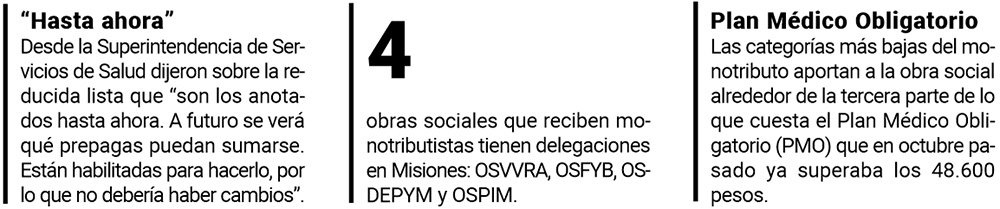 Lo cierto es que los monotributistas de Misiones que hoy tienen que optar por una obra social apenas tienen cuatro opciones si lo que buscan es una obra social con delegación física en la provincia. Esto es así porque 15 de las 19 obras sociales que aceptaron recibir a monotributistas a partir del 1 de diciembre no tienen base en nuestra provincia.