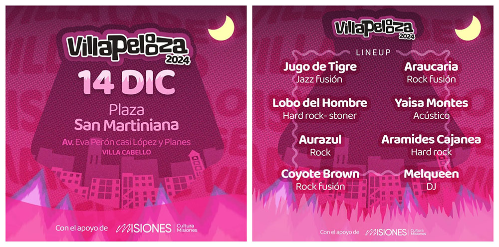Los artistas que se presentarán en esta edición 2024 del Villapelooza son: Juego de Tigre; Lobo del Hombre; Yaisa Montes; Aurazul; Coyote Brown; Aramides Cajanea; Araucaria y DJ Melqueen.