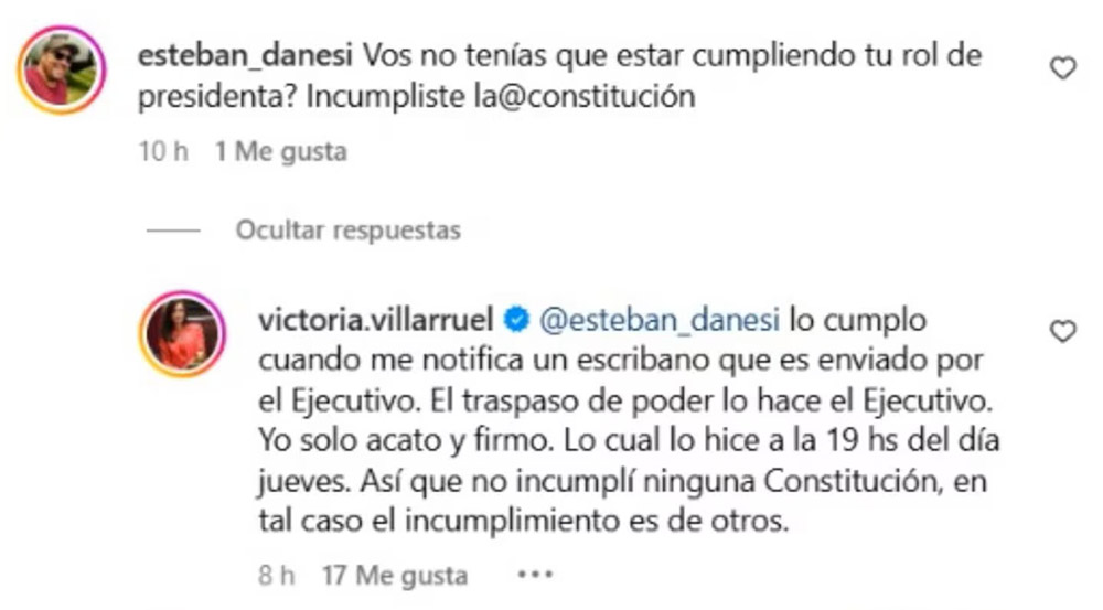 Un usuario le preguntó si no debía cumplir su rol de presidenta y la acusó de incumplir la Constitución, a lo que la funcionaria contestó: “La cumplo cuando me notifica un escribano que es enviado por el Ejecutivo”.