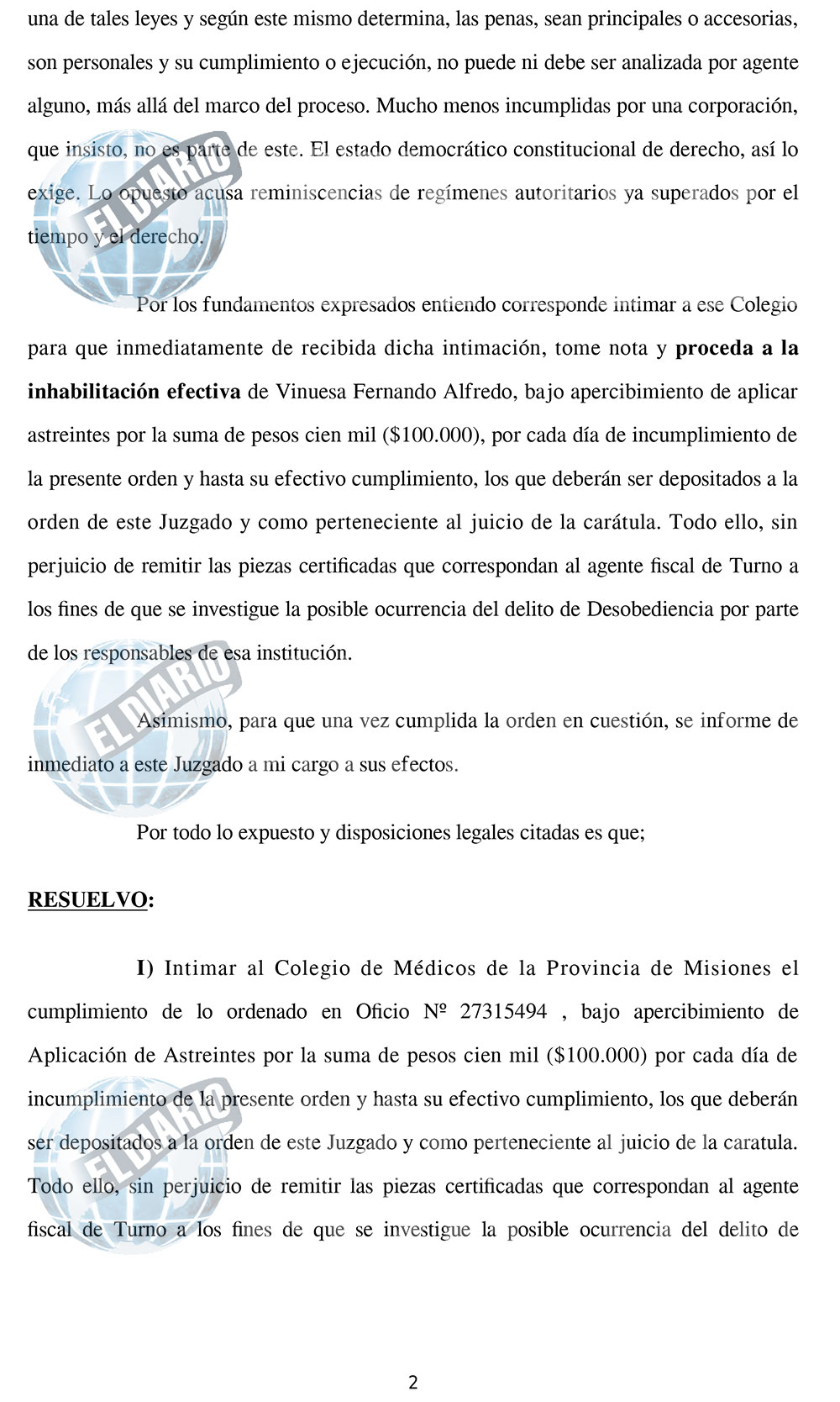 “Por los fundamentos expresados corresponde intimar al Colegio de Médicos para que inmediatamente de recibida dicha intimación, tome nota y proceda a la inhabilitación efectiva de Fernando Alfredo Vinuesa bajo apercibimiento de aplicar astreintes por la suma de 100.000 pesos por cada día de incumplimiento de la presente orden y hasta su efectivo cumplimiento, los que deberán ser depositados a la orden de este Juzgado y como pertenecientes al juicio de la carátula y sin perjuicio de remitir las piezas a la fiscalía de turno para que se investigue la posible ocurrencia del delito de ‘desobediencia’ por parte de los responsables de esta institución”, cierra su decisión el magistrado.