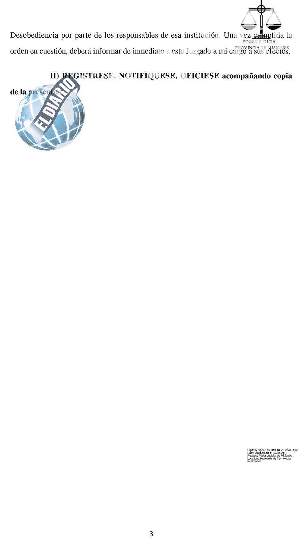 En otro tramo, Jiménez es enfático: “Debo recordar al Colegio de Médicos que es un organismo gremial y que las órdenes judiciales deben cumplirse sin más trámites, sin perjuicio del derecho que asiste al interesado de recurrir la sentencia (…) Es el imputado quien resulta parte en el proceso penal y no el Colegio quien, insisto, sólo debe cumplir la manda judicial tal y como fuera dictada e impuesta”.
