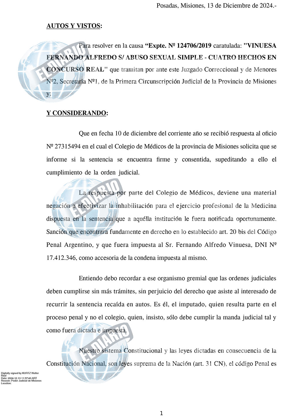El juez Correccional y de Menores 2 de la Primera Circunscripción Judicial, César Raúl Jiménez, notificó durante la mañana de este viernes al Colegio de Médicos de Misiones para que cumpla con la orden de inhabilitación perpetua para el médico Fernando Alfredo Vinuesa, condenado hace una semana a la pena de cuatro años de prisión efectiva por cuatro hechos en concurso real de abuso sexual simple, cuyas víctimas fueron sus pacientes.