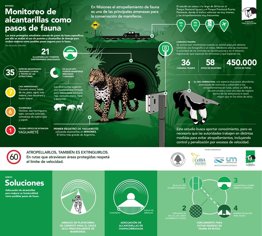 Entre el 2022 y 2023 se monitorearon distintos sectores de la Ruta Nacional 12, la Provincial 101, accesos al área Cataratas, el Aeropuerto dentro del Parque Iguazú y el Parque Provincial Puerto Península para evaluar la presencia y comportamiento de especies en los alrededores de estas estructuras. El estudio demostró que diversas especies de animales, muchas de ellas en peligro de extinción, utilizaban alcantarillas y puentes para atravesarlas.