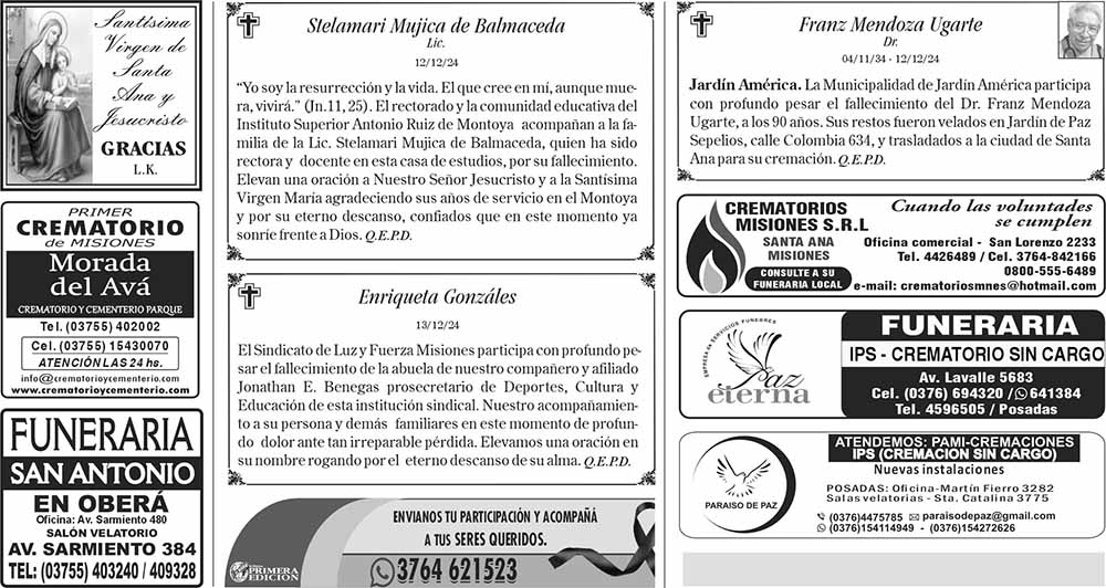 Fúnebres del Sábado 14 de Diciembre de 2024
