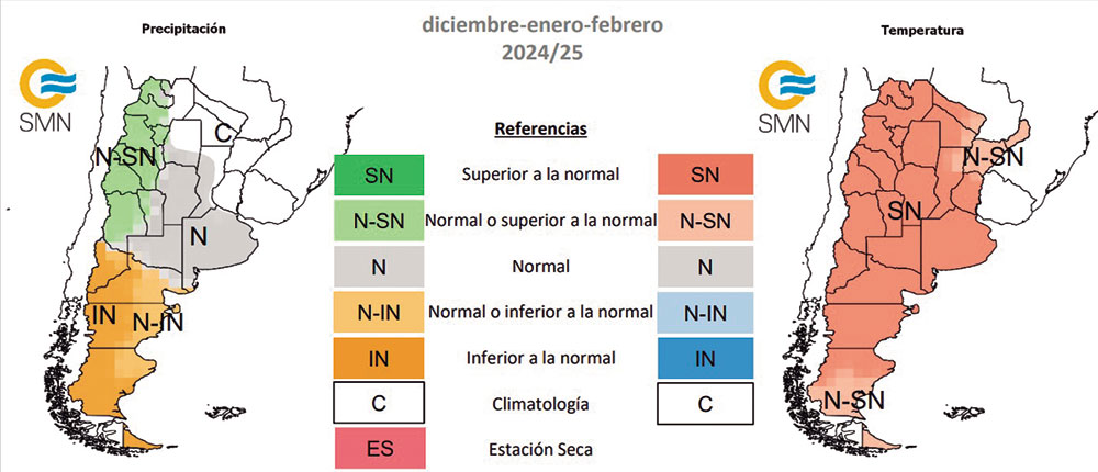 Como es habitual, el Servicio Meteorológico Nacional (SMN) dio a conocer sus valores promedio de precipitaciones y temperaturas para el trimestre comprendido entre diciembre de 2024, enero y febrero de 2025. Segmentado por colores para diferenciar los rangos previstos en cada caso, llamó la atención que el NEA, parte del Litoral (Entre Ríos y noreste de Santa Fe) y casi todo Santiago del Estero y este de Salta en el NOA aparecieron en color blanco y sin ninguna referencia.