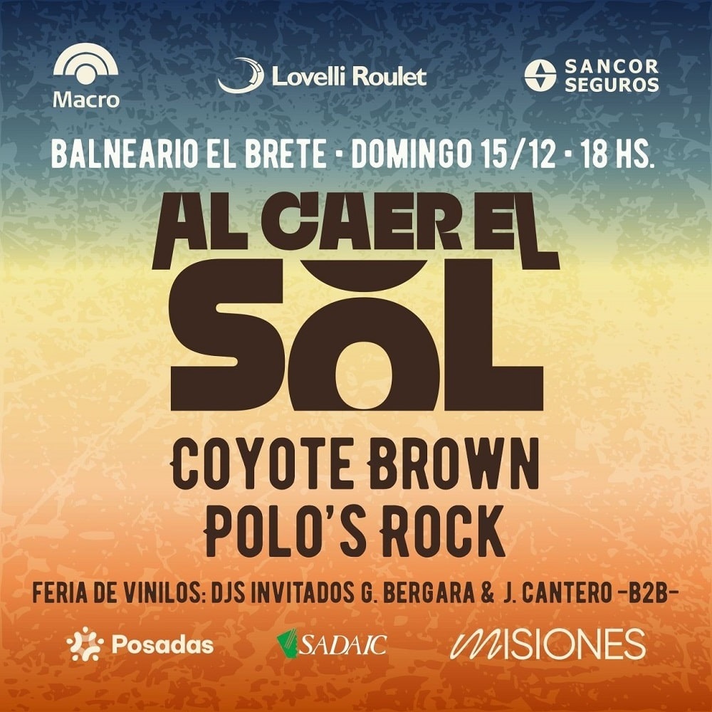 Llega una nueva edición del Festival del Música Al caer el Sol, que tendrá como artistas invitados a Polo’s Rock, que llega con toda la fuerza de su rhythm n’ blues y hard rock y previamente abrirá el fuego la banda de Coyote Brown. Además, el evento contará con la animación de los DJ’s Gustavo Bergara y Javier Cantero, quienes participarán en la Feria de Vinilos. La cita será este domingo, a partir de las 18 horas, en el balneario El Brete de Posadas.