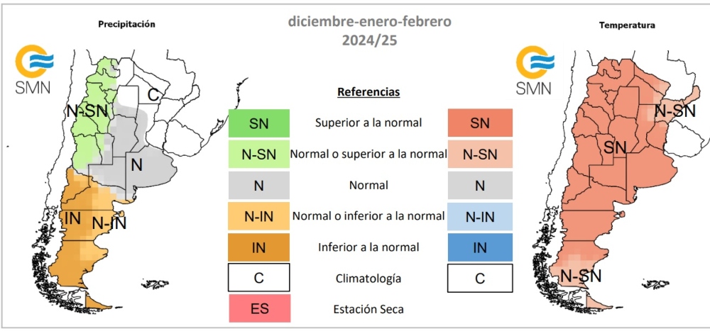 Como es habitual, el Servicio Meteorológico Nacional (SMN) dio a conocer sus valores promedio de precipitaciones y temperaturas para el trimestre comprendido entre diciembre de 2024, enero y febrero de 2025. Segmentado por colores para diferenciar los rangos previstos en cada caso, llamó la atención que el NEA, parte del Litoral (Entre Ríos y noreste de Santa Fe) y casi todo Santiago del Estero y este de Salta en el NOA aparecieron en color blanco y sin ninguna referencia.