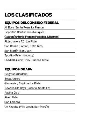 Los equipos del interior son All Boys de Santa Rosa, La Pampa; Deportivo Confluencia de Neuquén; Rioja Juniors FC de La Rioja; San Benito de Paraná, Entre Ríos; San Martín de San Juan; Sportivo Palermo de Jujuy; UNNOBA de Junín, provincia de Buenos Aires y el representante misionero, Guaraní Antonio Franco.