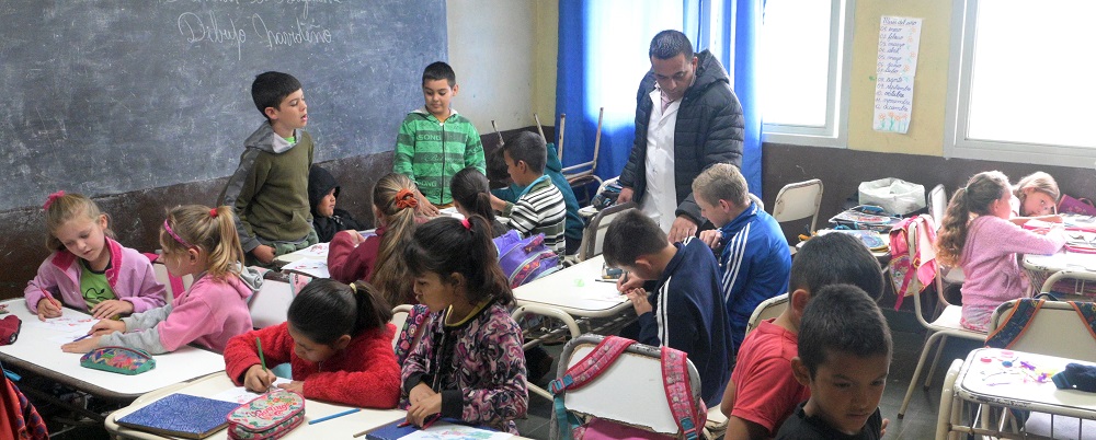 Sandro Fernández está a cargo de sexto y séptimo grado. “Soy el encargado de preparar a los niños que van a dar este paso tan importante a la secundaria”, dijo orgulloso el docente, que se recibió en la Escuela Normal Superior 13, de San Vicente, de donde es oriundo. Trabajaba en construcción hasta que se lastimó la espalda y decidió estudiar magisterio, como varios en su familia. El 25 de julio de 2018 comenzó a trabajar en esta escuela. Aquí conoció a su esposa, Camila, y es padre de una niña. “No me acostumbro del todo, pero estoy bastante avanzado en cuanto al conocimiento del portuñol”, indicó.