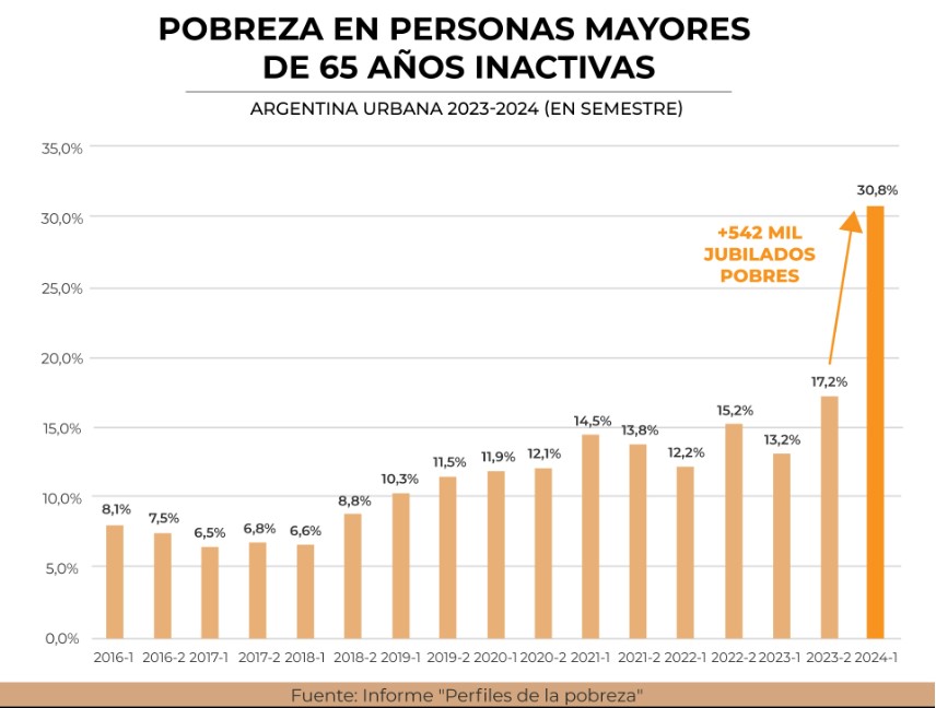 “Este dato muestra que 1 de cada 3 jubilados vive en condiciones de pobreza, y que en el último año más de medio millón de jubilados (542 mil personas) se sumaron a esta situación”, destaca el informe.