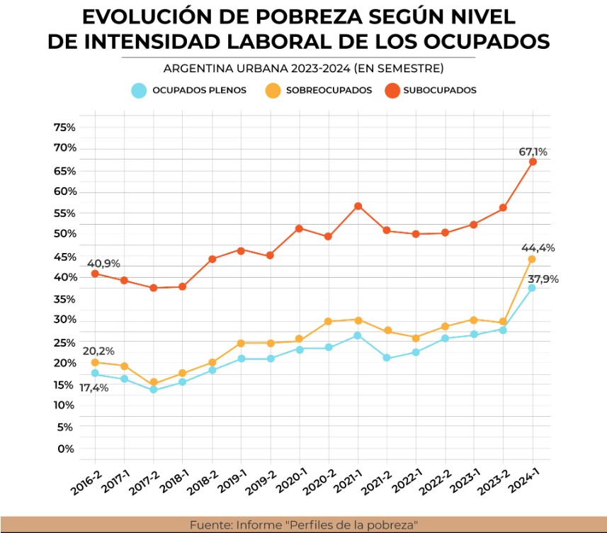 El estudio también clasifica a los trabajadores según su carga horaria en tres grupos: ocupados plenos, sobreocupados y subocupados. En el caso de los subocupados, es decir, aquellos que trabajan menos horas de las necesarias o deseadas, se observa un notable incremento de la pobreza, que pasó del 40,9% en 2016 al 67,1% en 2024. Esto refleja su alta vulnerabilidad, ya que suelen enfrentar ingresos bajos e insuficientes, característicos de este tipo de empleo.