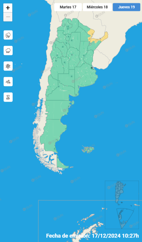 Según el parte compartido por el ente nacional, “el área será afectada por tormentas aisladas, algunas localmente fuertes. Las mismas podrán estar acompañadas por abundante caída de agua en cortos periodos, fuerte actividad eléctrica, ráfagas intensas y posible caída de granizo. Se esperan valores de precipitación acumulada entre 15 y 30 mm, pudiendo ser superados de forma puntual”.