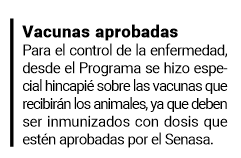 El profesional destacó además que las vacunas deben ser aprobadas por el Senasa, ya que las nacionales pasan controles de potencia, esterilidad e inocuidad y advirtió sobre el riesgo de adquirir vacunas de Brasil o Paraguay debido al desconocimiento de su efectividad y a que su ingreso constituye un acto de contrabando. Por esa razón, una vez que se diagnostica el caso índice, se determina el alerta por brote de rabia paresiante en la población del vampiro (Desmodus rotundus), ya que la enfermedad se manifestó en los bovinos que son su fuente de alimentación.