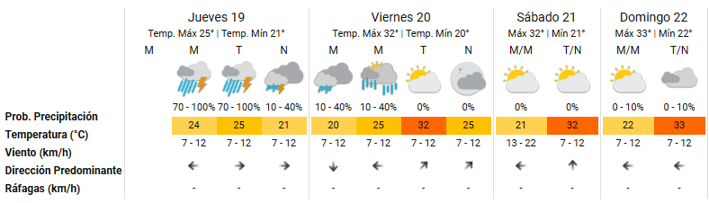Mañana viernes se mantienen pocas probabilidades de precipitaciones aisladas, entre la madrugada y la mañana, de entre 10-40%, principalmente para la zona norte de Misiones. De esta manera, las lluvias se disiparían y volvería el clima bueno y cálido.