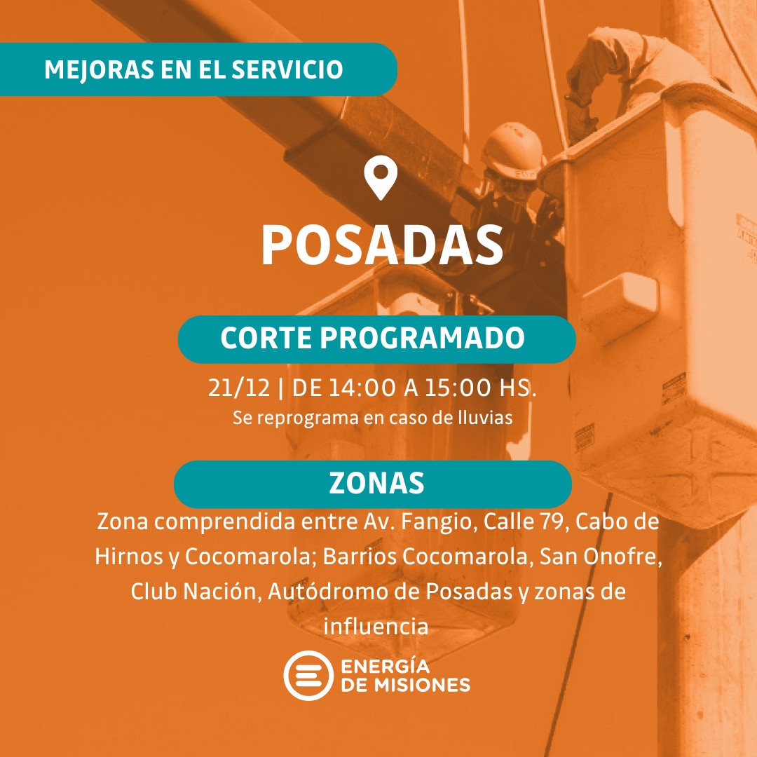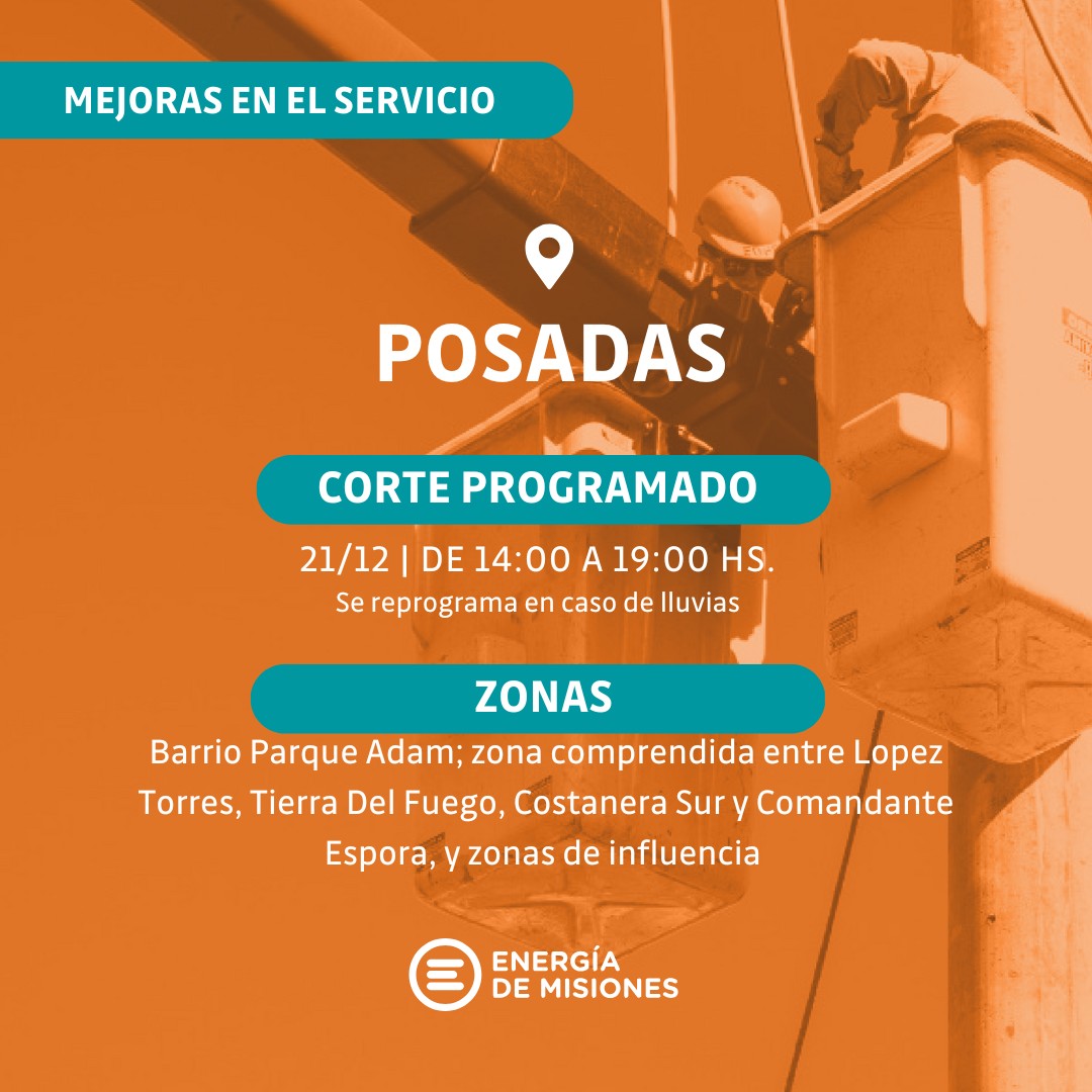 En Posadas, las interrupciones serán más extensas: desde las 14 hasta las 19, el suministro estará afectado en el barrio Parque Adam y el sector comprendido entre las avenidas López Torres, Tierra del Fuego, Costanera Sur y Comandante Espora. Además, de 14 a 15, habrá un corte en barrios como Cocomarola, San Onofre y Club Nación, entre otros, debido a remodelaciones en líneas de media tensión.