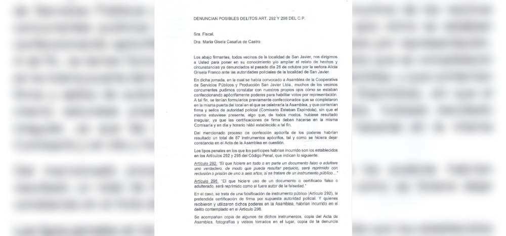 El primer caso denunciado se vincula con hechos ocurridos el pasado 26 de octubre, durante una asamblea de la Cooperativa. Según el relato de las denunciantes, se habría constatado la confección de al menos 87 poderes falsos destinados a habilitar votos por representación en la asamblea.