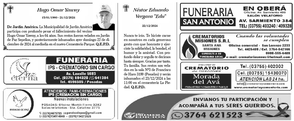 • Fúnebres del Sábado 21 de Diciembre de 2024
