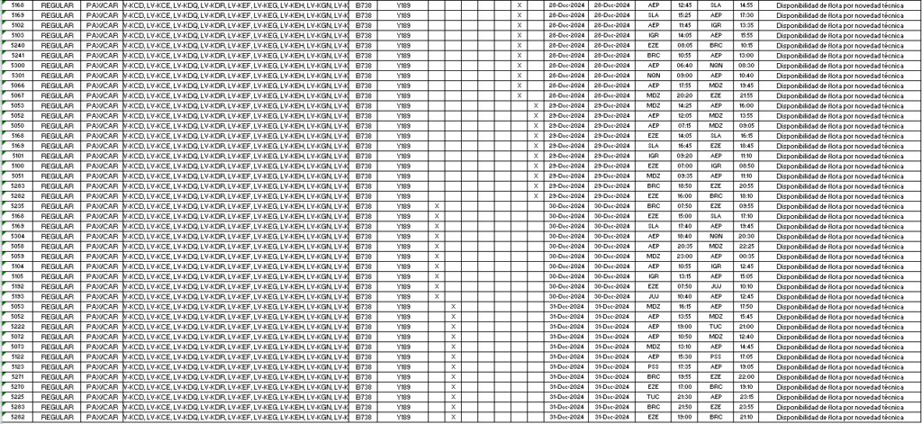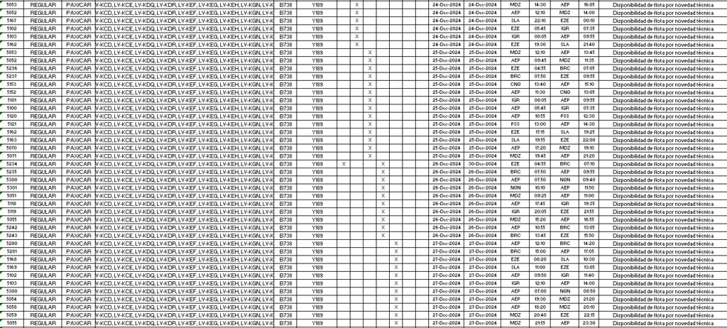 El sitio Aviación en Argentina publicó un documento de la ANAC con el formulario de cancelaciones de vuelos en donde figuran los servicios que no prestará la aerolínea desde el 24 hasta el 31 de diciembre.