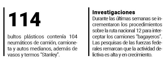 El transporte interceptado en el puesto de control Urugua-í de la ruta nacional 12, contenía 104 cubiertas para camión, camioneta y automóviles. Pero también cajas con productos de la marca “Stanley”, termos, vaso y jarras.
