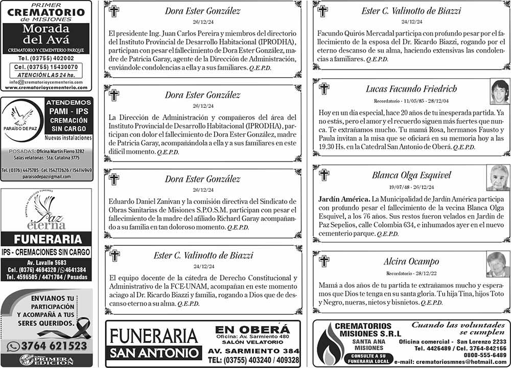 Fúnebres del Sábado 28 de Diciembre de 2024