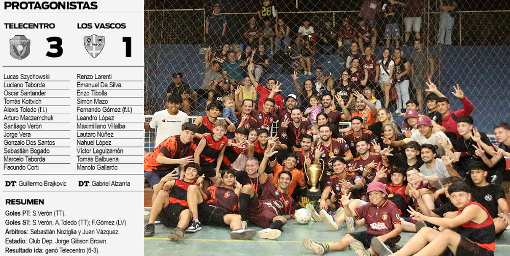 Telecentro Tacuarí se quedó el último jueves por la noche con todos los festejos, tras consagrarse nuevamente campeón de la Asociación Posadeña de Fútbol de Salón (APoFuSa) y alcanzar así el tercer título consecutivo, tras las celebraciones en el Apertura de este año y en el Clausura 2023.