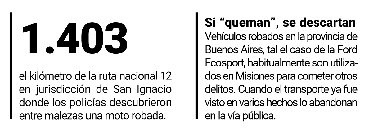 La primera intervención correspondió a pesquisas de la comisaría Octava que detectaron sobre la avenida Buchardo en Posadas una camioneta Ford Ecosport abandonada que registraba una denuncia por robo en la provincia de Buenos Aires. Las mismas voces remarcaron a este Diario que la Ford Ecosport habría sido utilizada para actividades ilícitas y que continúa la investigación con el registro de cámaras de seguridad para determinar si las sospechas pueden ampliarse e identificar a delincuentes locales, principalmente dedicados al delito contra la propiedad, “escruches” a viviendas familiares, principalmente posadeñas.